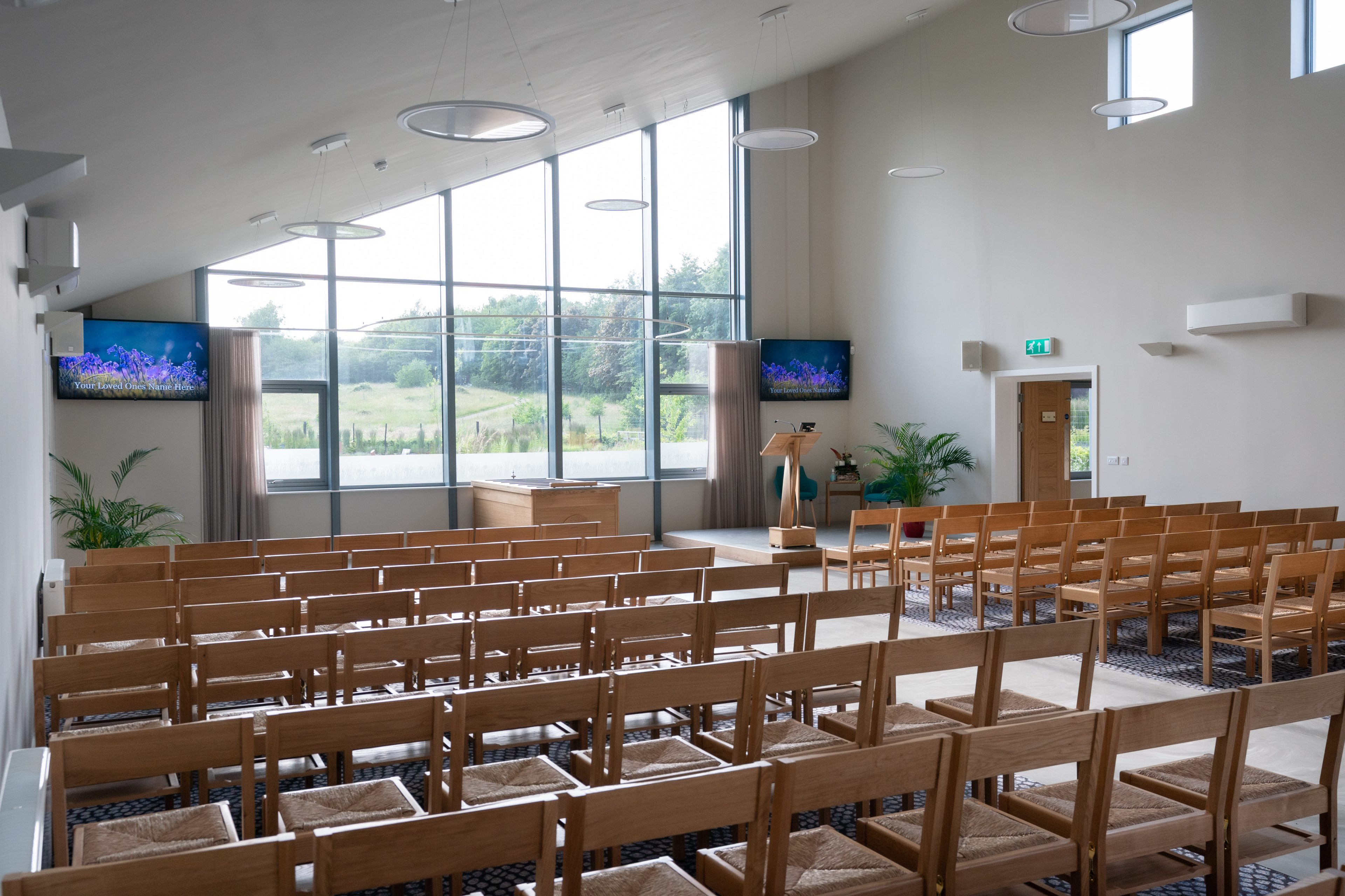 The ceremony hall seats 130 guests and has a large picture window framing views across beautifully landscaped memorial gardens. A further 80 people can follow the service on screens in our indoor waiting area.